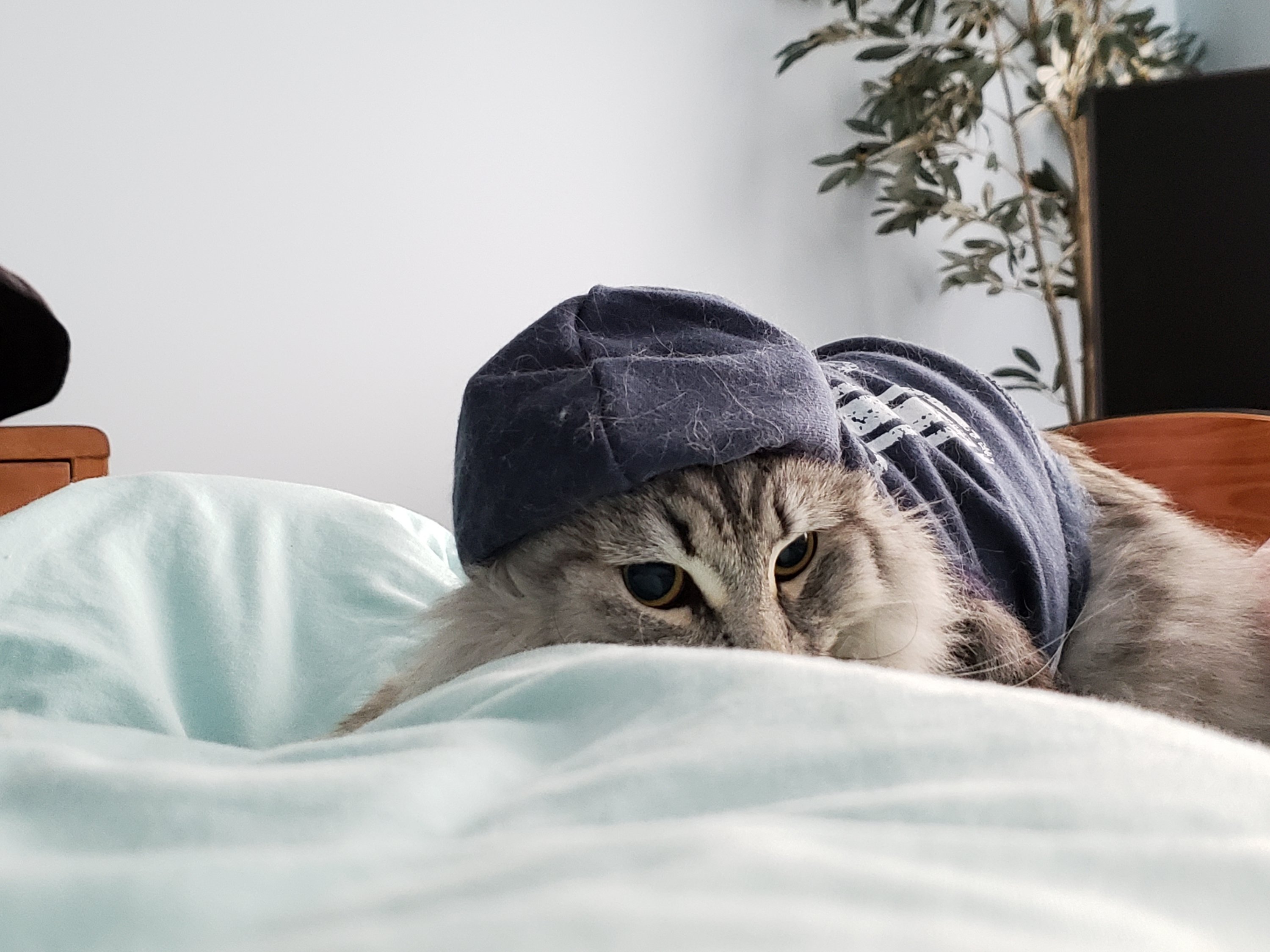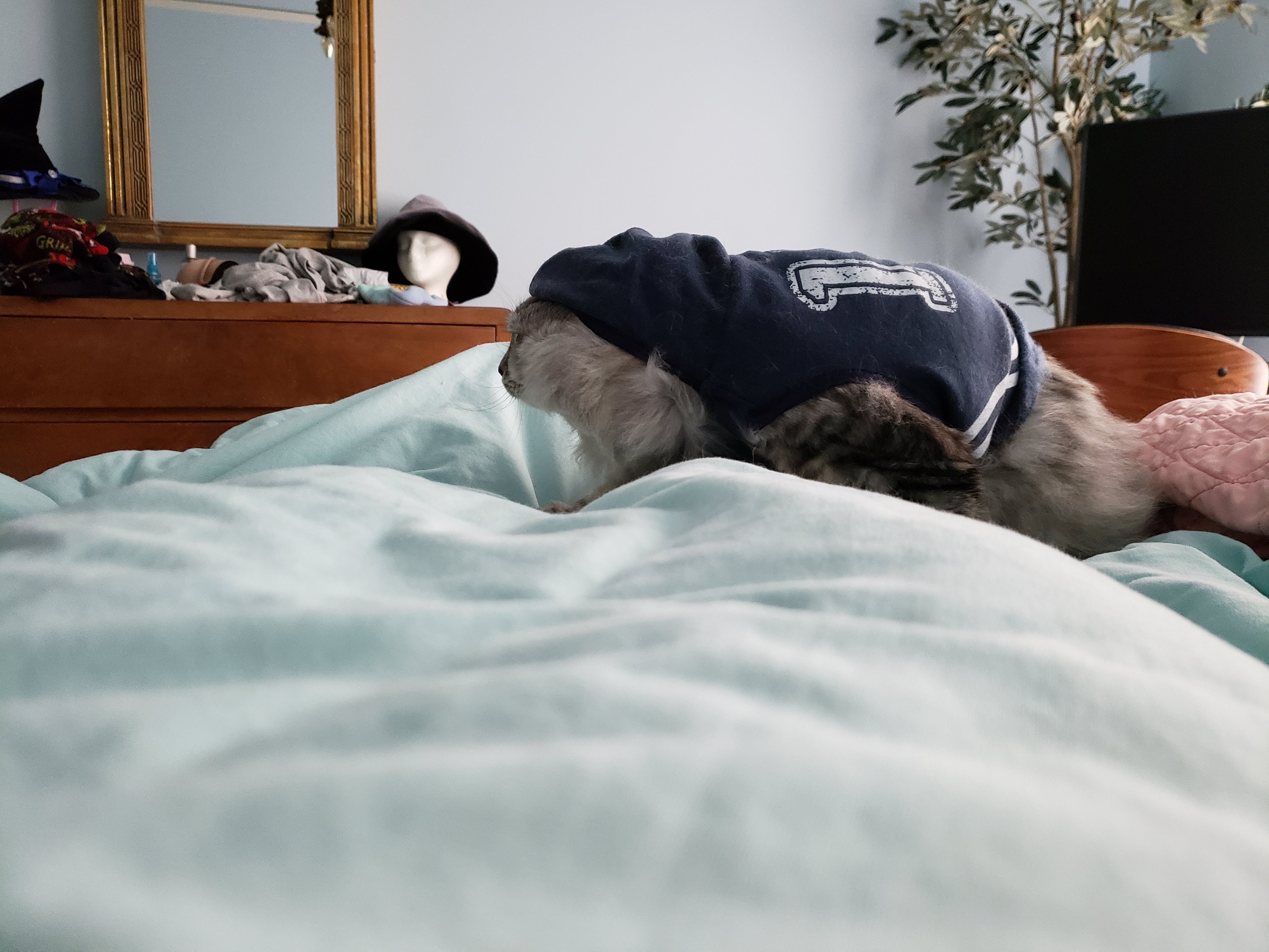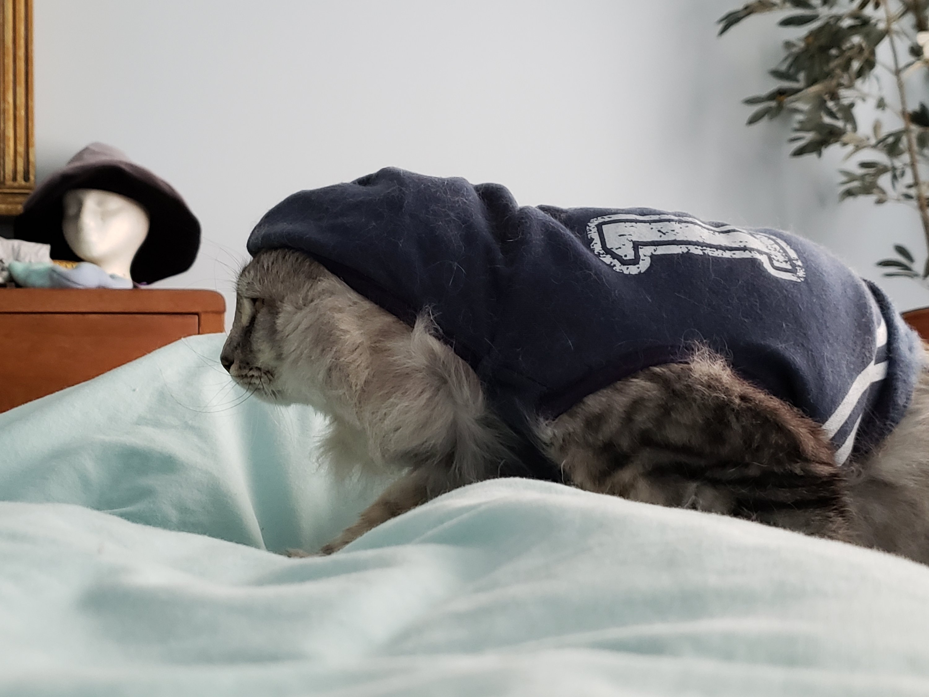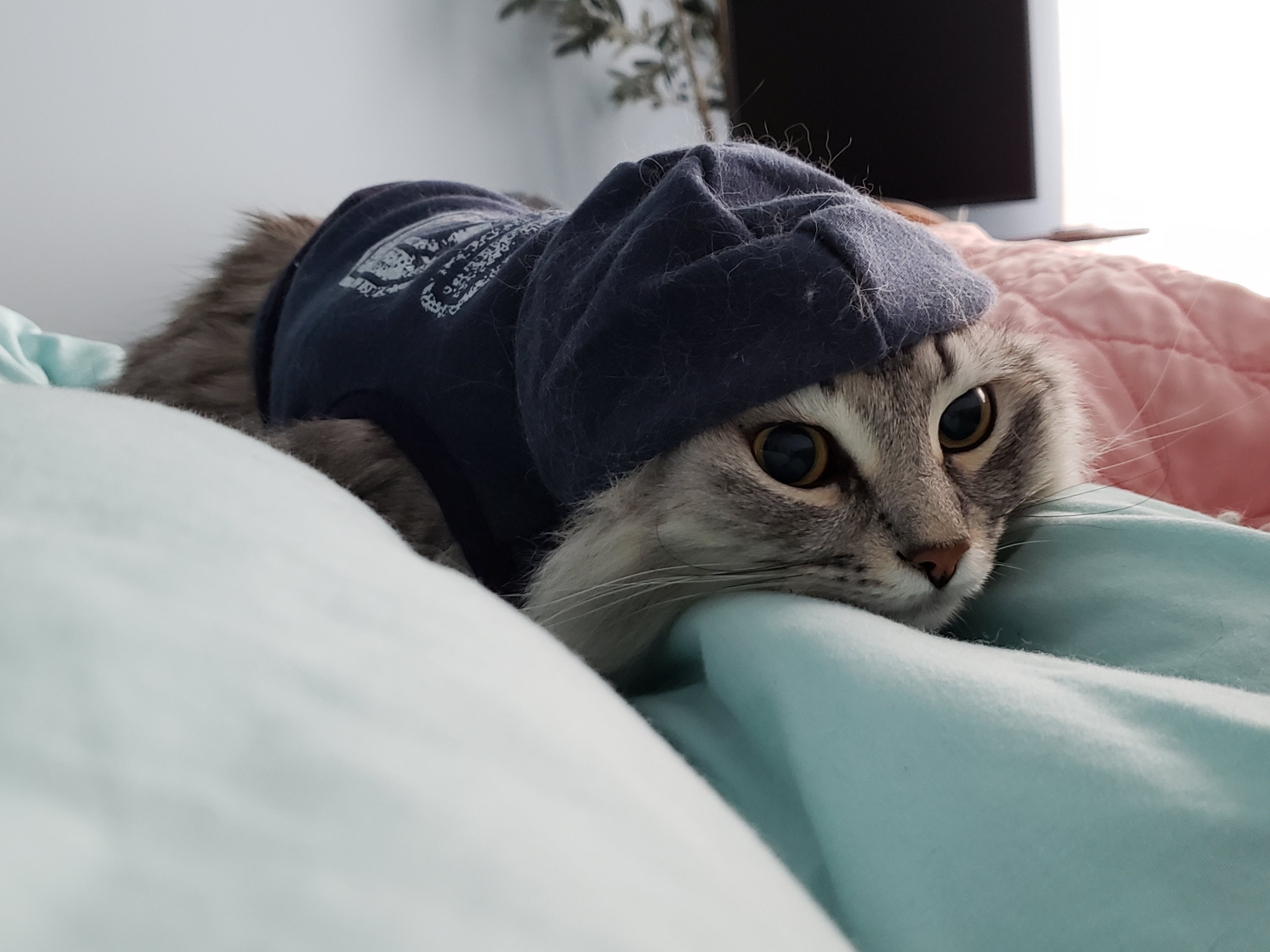 Last week we put Marlin’s hoodie on him for fun, and I noticed he became far more chill while wearing it. He just stayed with me on the dining table while I practiced coding, and didn’t do much aside from change positions. By the time we were going to bed, we decided to keep the hoodie on him because we worried his energy would come back after relaxing for a couple of hours.
