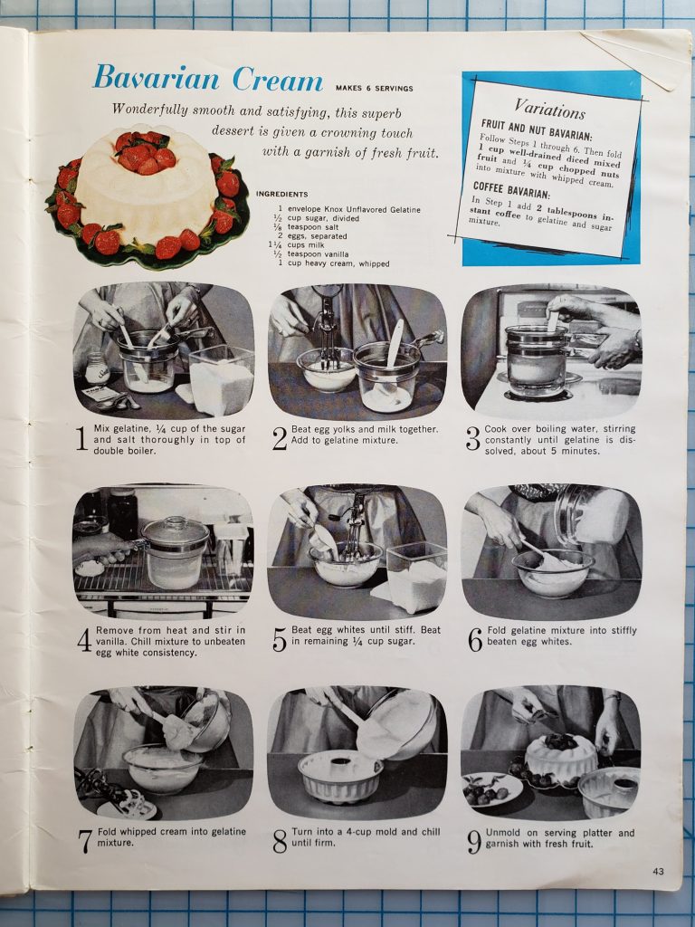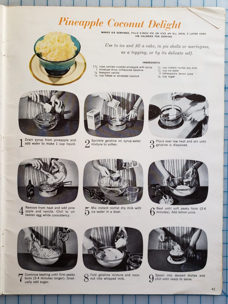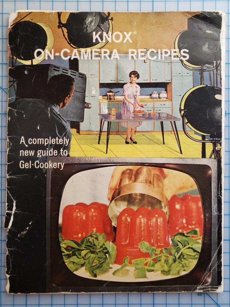Anyway, we actually had a vintage gelatin recipe book that I could get started with! This Knox On-Camera Recipes book belonged to Mike’s grandmother on his father’s side. It’s got both sweet and savory (🤮) recipes. I’m only including some photos of the desserts in this post, but maybe someday I’ll make a post with the recipes that include corned beef and tuna..