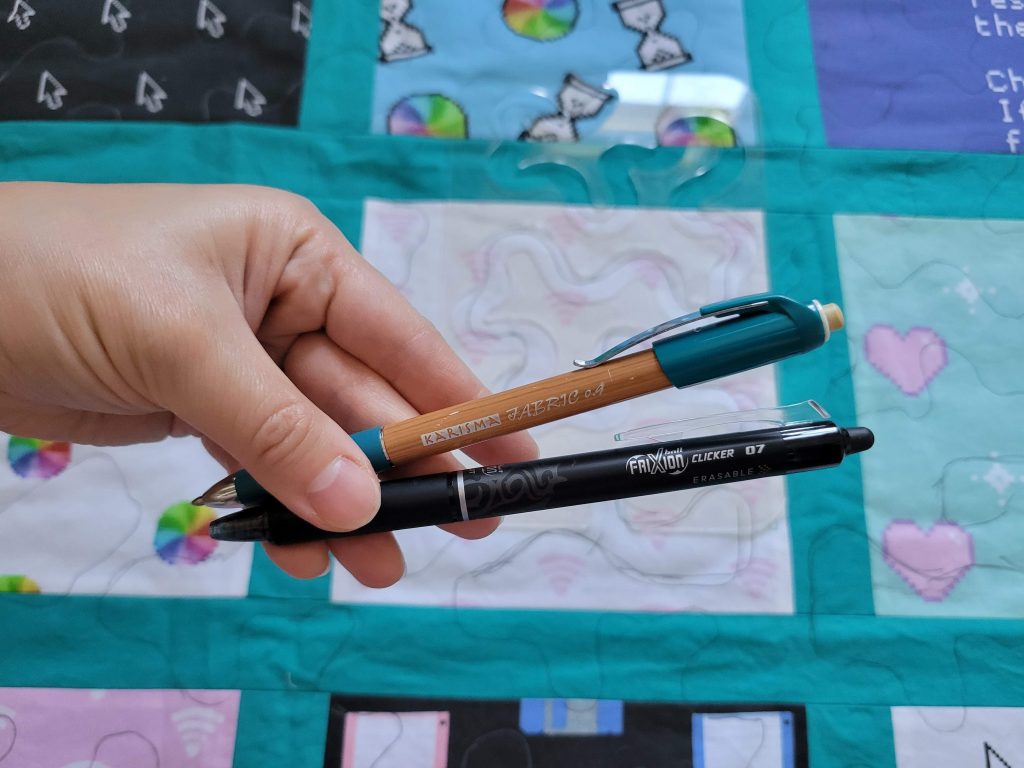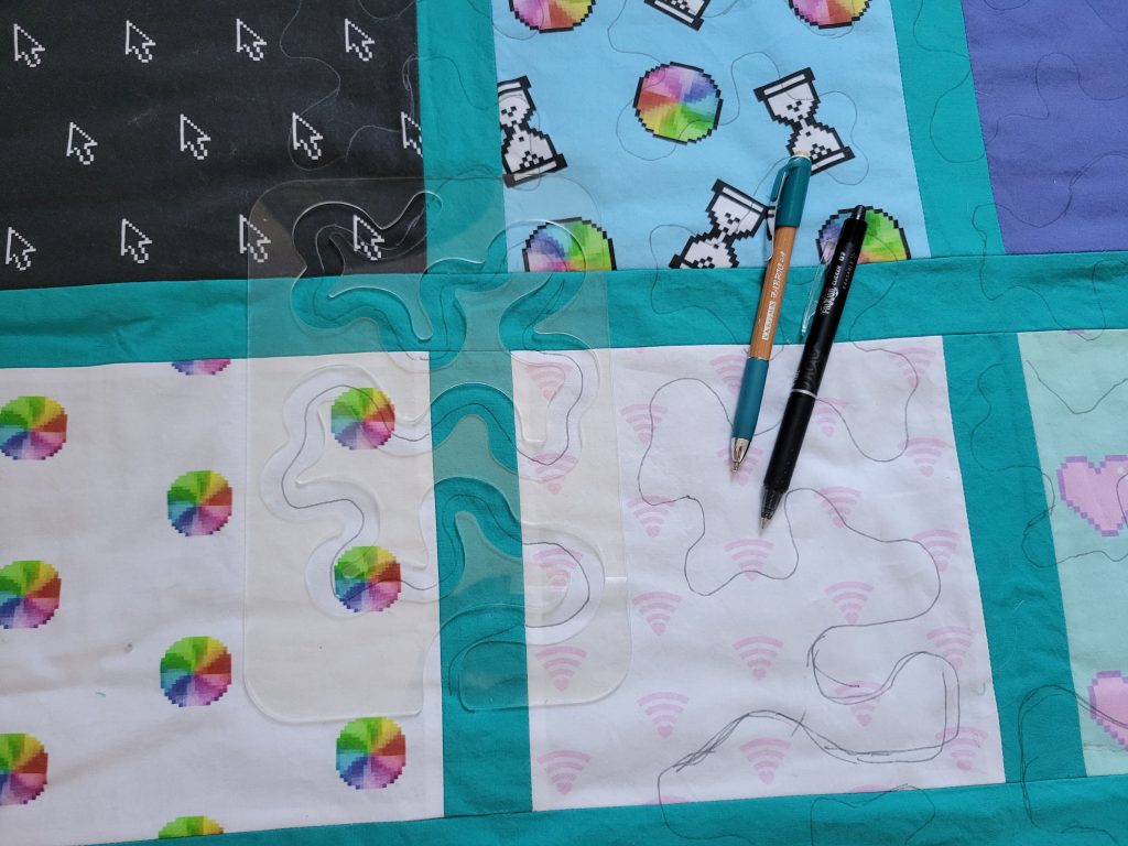 I used both a Frixon pen and this mechanical chalk pencil to trace out the lines on my quilt. I prefer the Frixon pen since it’s really easy to make the lines disappear with an iron, but I needed the chalk pencil for the dark fabrics.