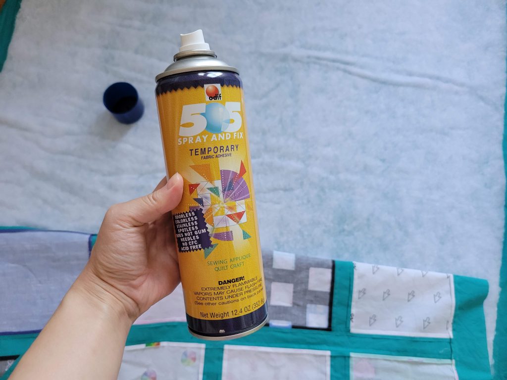 Then I used temporary spray adhesive to attach the batting to both sides of the quilt. Make sure to spray onto the batting and not the fabric so that you minimize the possibility of staining the fabric with too much adhesive.