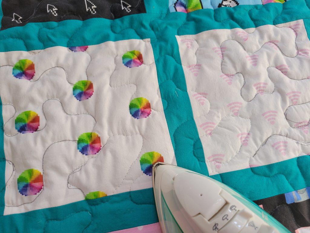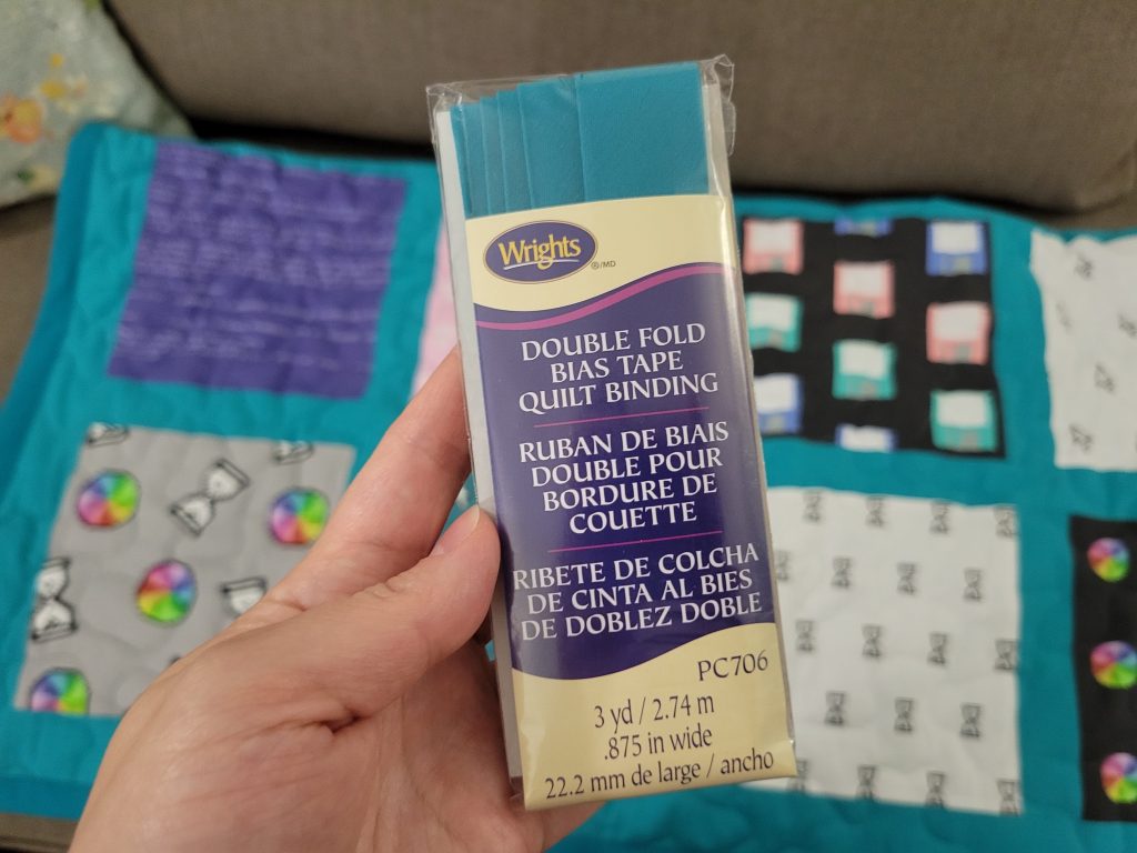 So I ended up buying the fabric for the borders and backing, as well as bias tape, from Joanns the next time I went. It wasn’t a perfect match, but good enough.