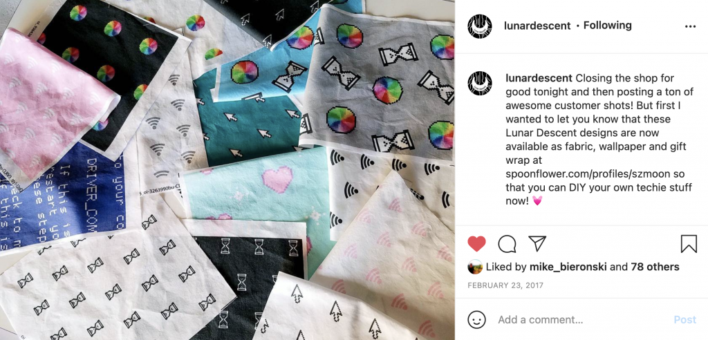 When I shut down my clothing line Lunar Descent in 2017, I decided to create fabric inspired by my designs up for sale on Spoonflower so that anyone could sew up tech themed items for themselves. Spoonflower requires users to first purchase at least a swatch of their fabric before being able to list them for sale (really smart on their part, I’m guessing so that their platform isn’t flooded with untested designs), so I ended up with a bunch of these 8 x 8 inch pieces.