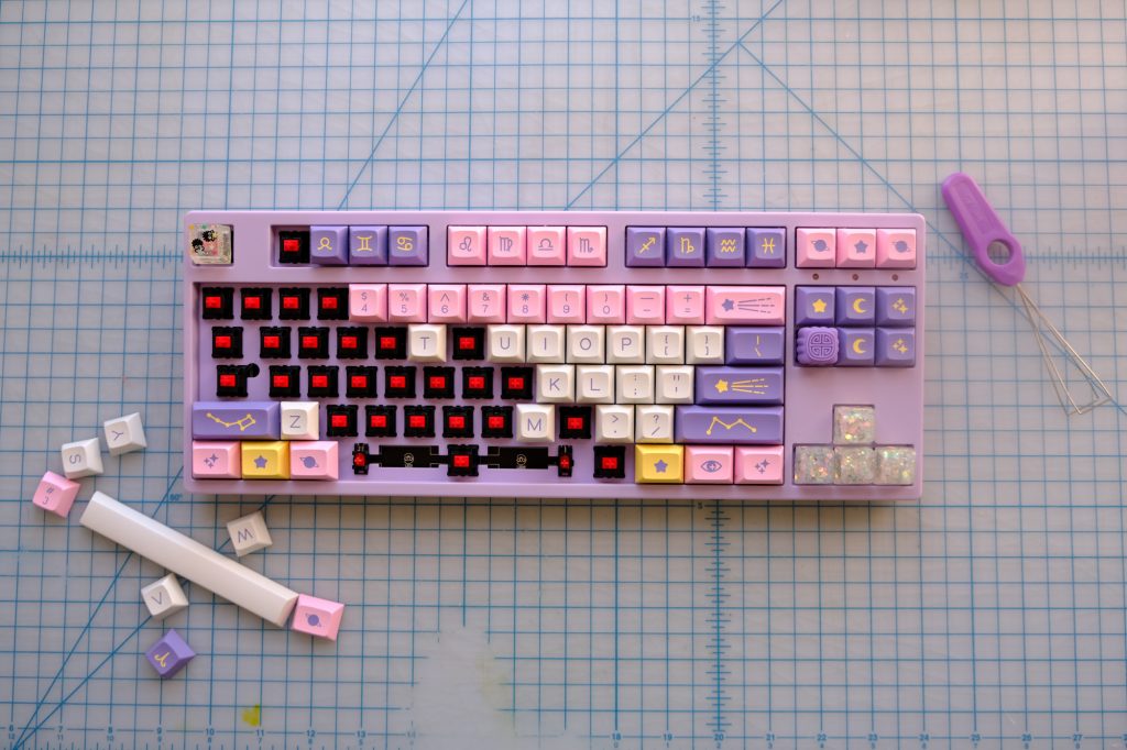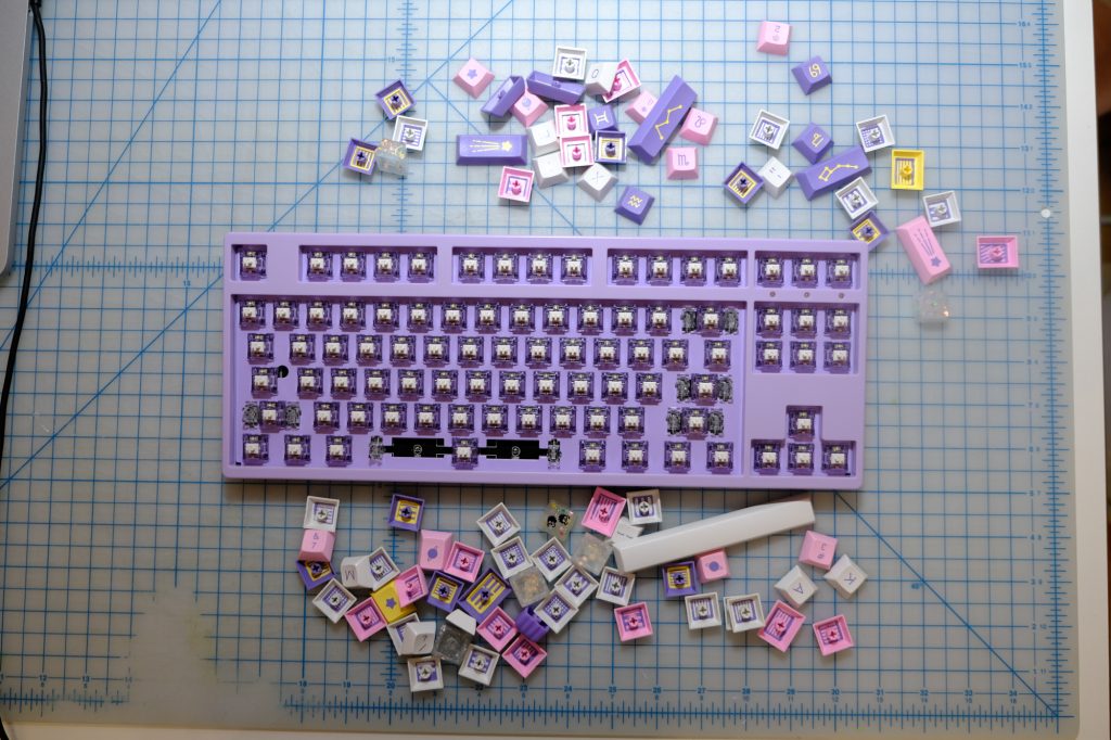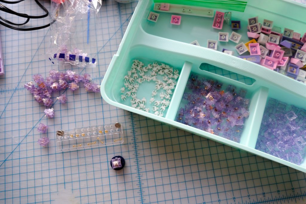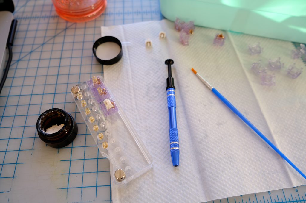 After removing the newly installed lavender switches, I decided on a new plan for this project. Originally I was going to skip lubing the switches and stabilizers, mainly because I figured that I wouldn’t be able to appreciate the difference (having never used custom switches before). But after two rounds of clumsy desolderings and some almost-destroyed contacts, I knew this keyboard wouldn’t be able to handle another mod. So it was at this point that I decided to go all out on the customization, and ordered the supplies I needed to properly prepare the switches for installation.