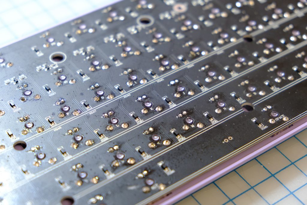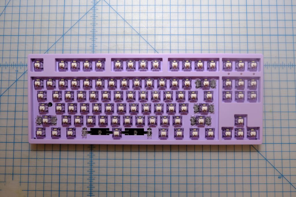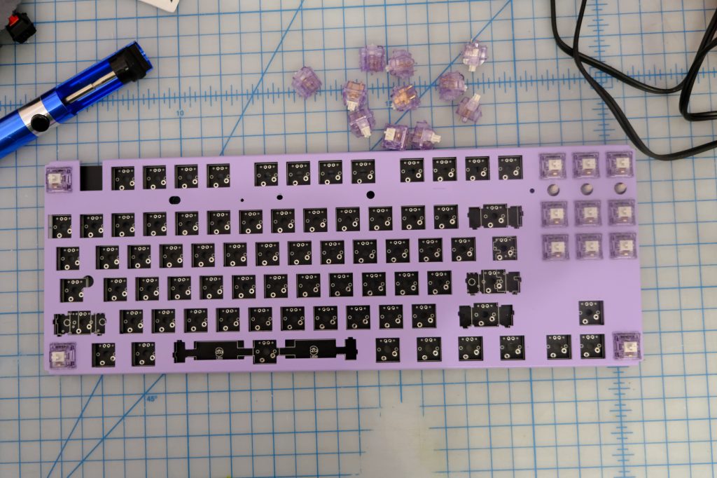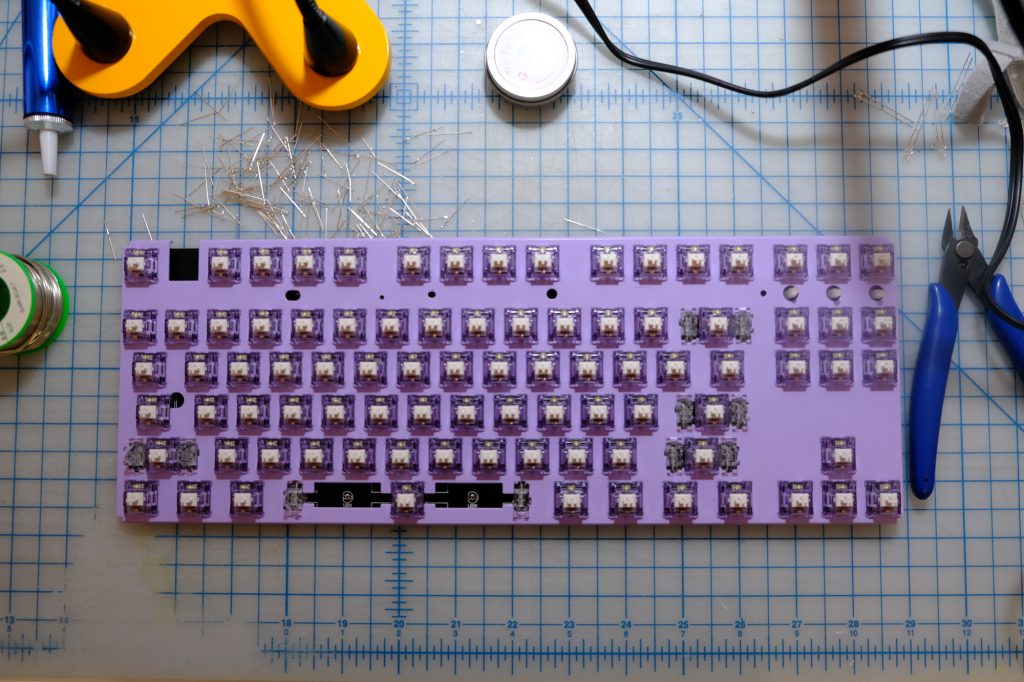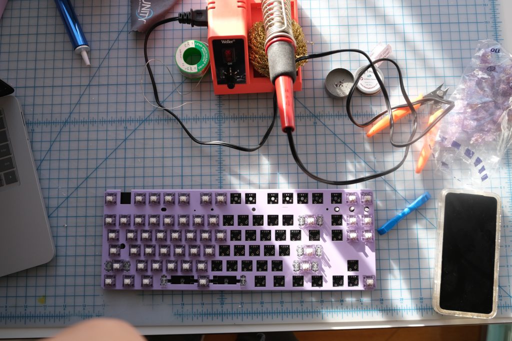 My biggest mistake was that I got so excited about successfully unsoldering all of the red switches, I immediately began soldering in the lavender switches – without putting the stabilizers in first. This meant that I had to unsolder all of those new switches so that I could remove the metal plate, to then attach the stabilizers. 🥲