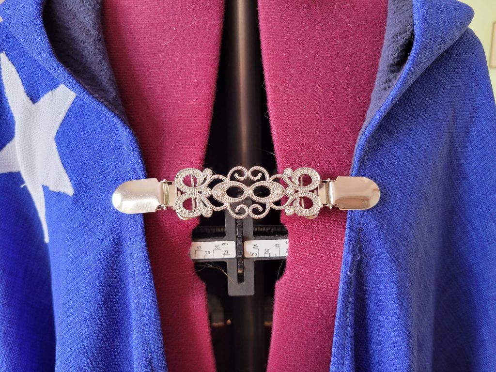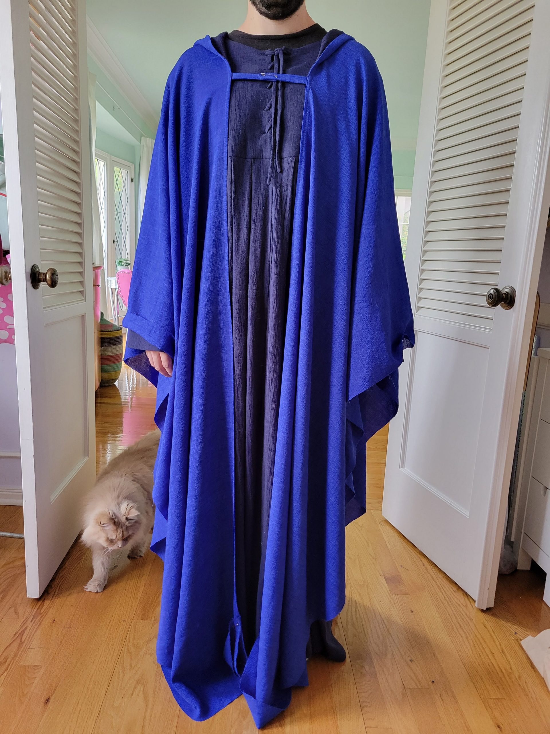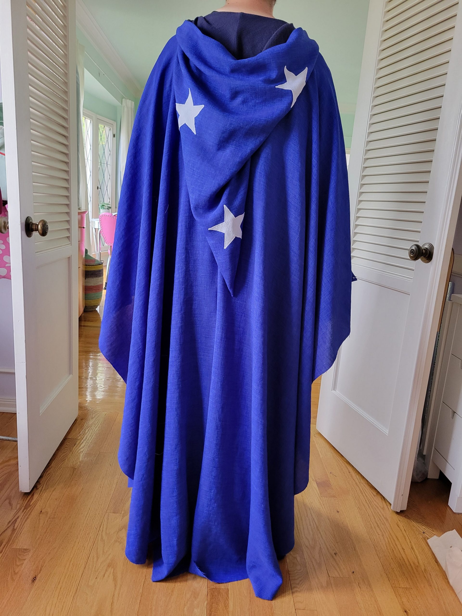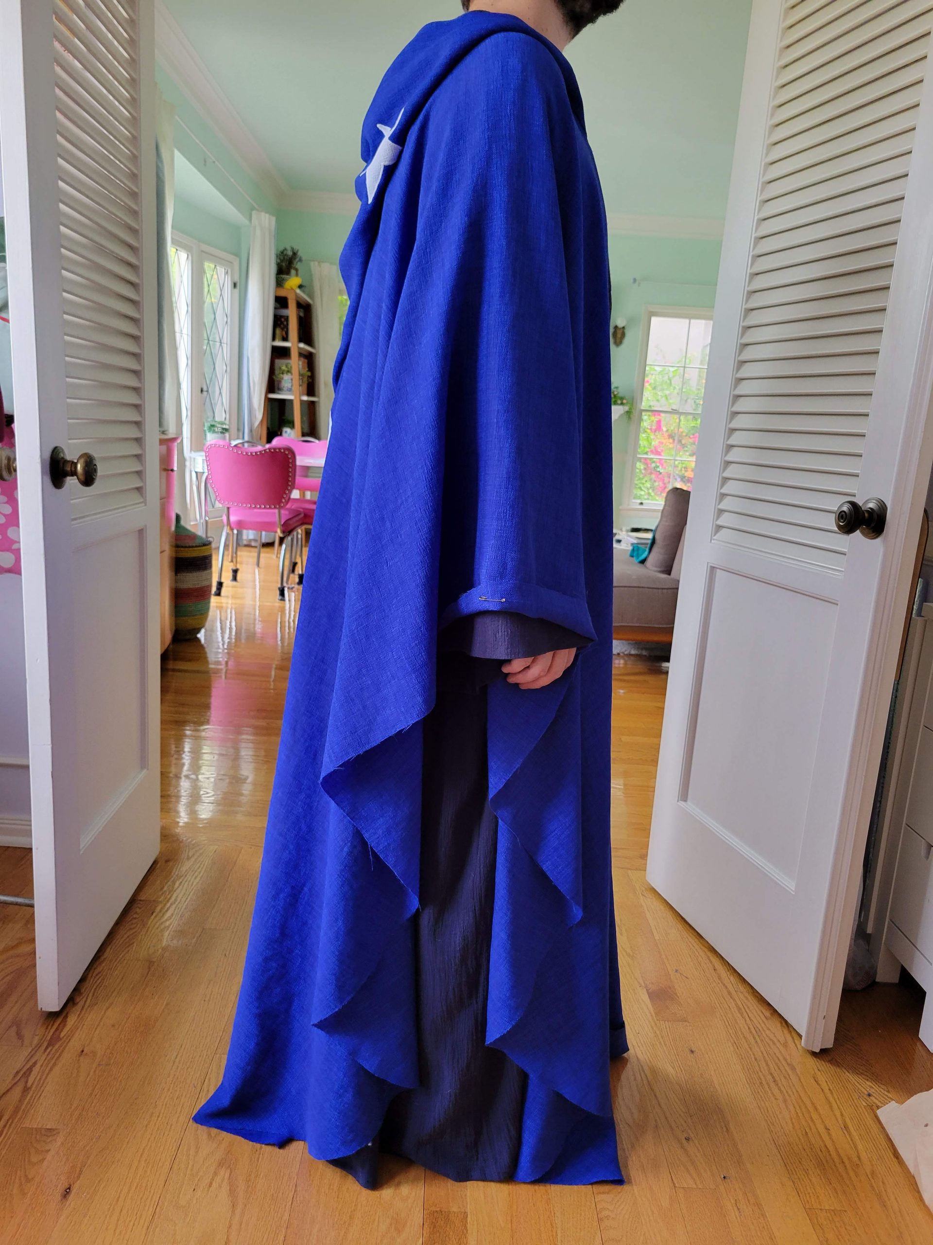 The cloak was made from the Telio Ballad Faux Linen in Bright Blue from fabric.com – 100% polyester 😬 but at it at least had a loose weave for air flow (we chose it for both its price and rough texture).
