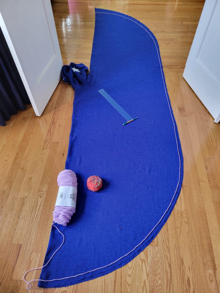 After marking the proper lengths from Mike’s try-on, I laid the cloak out flat so that I could trim off the excess fabric from the hem. The texture of the fabric was too rough to easily mark it without it constantly shifting, so I came up with what I considered a clever solution hahah – I laid down yarn along the cut line.