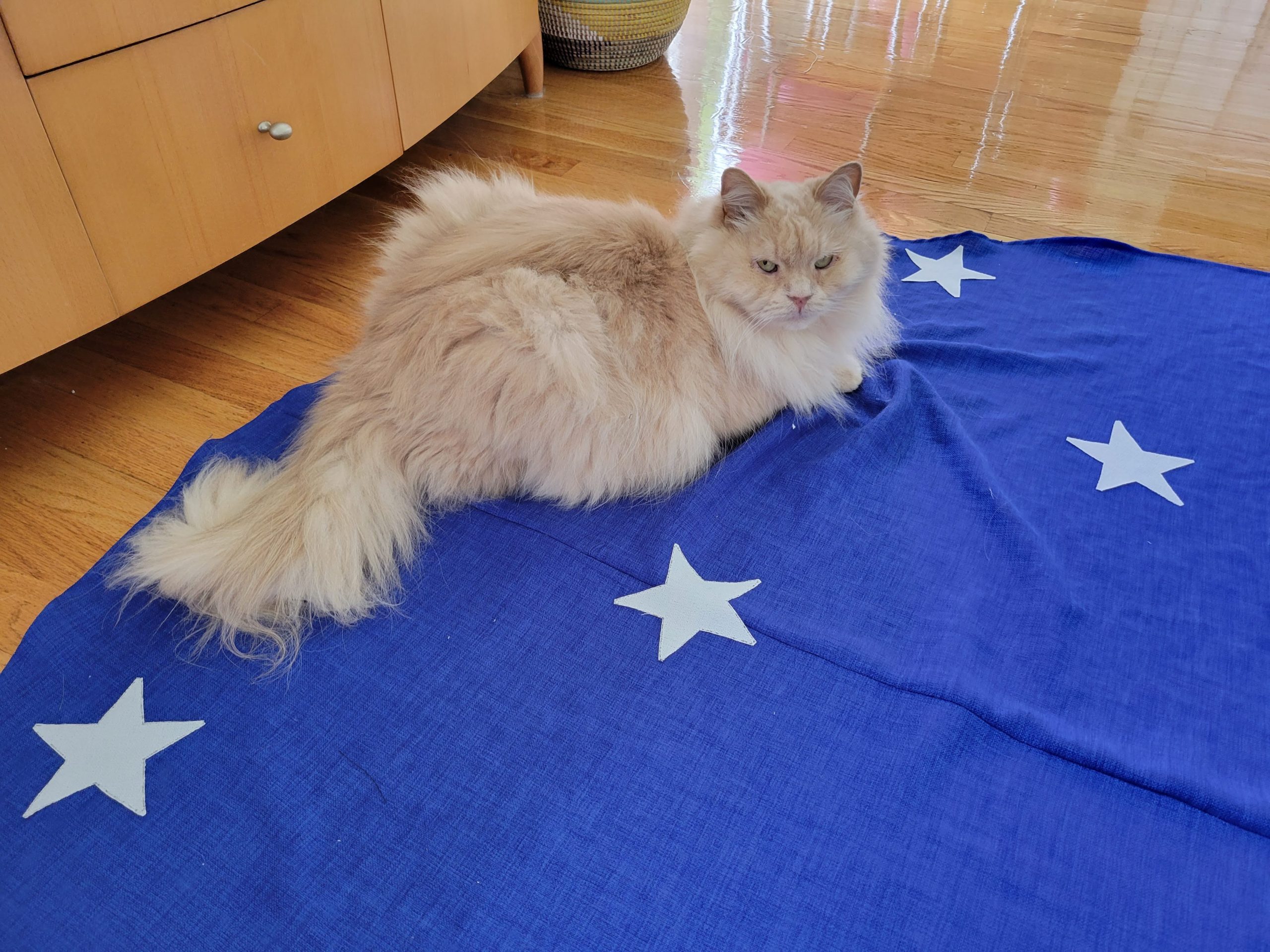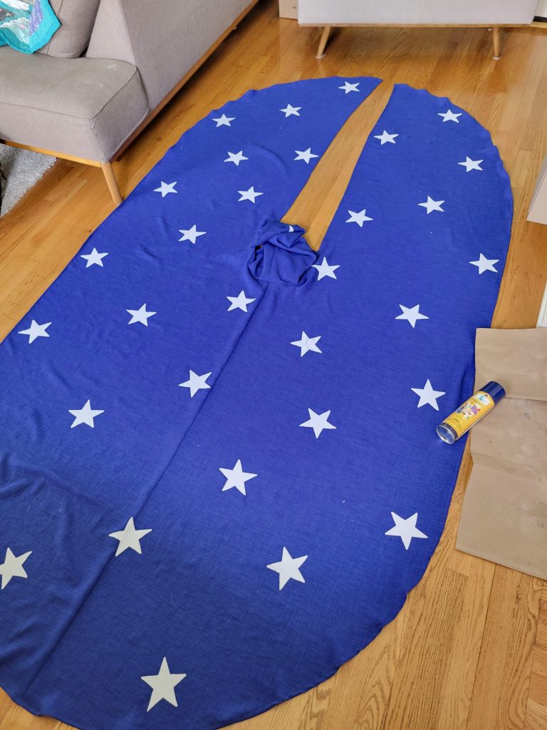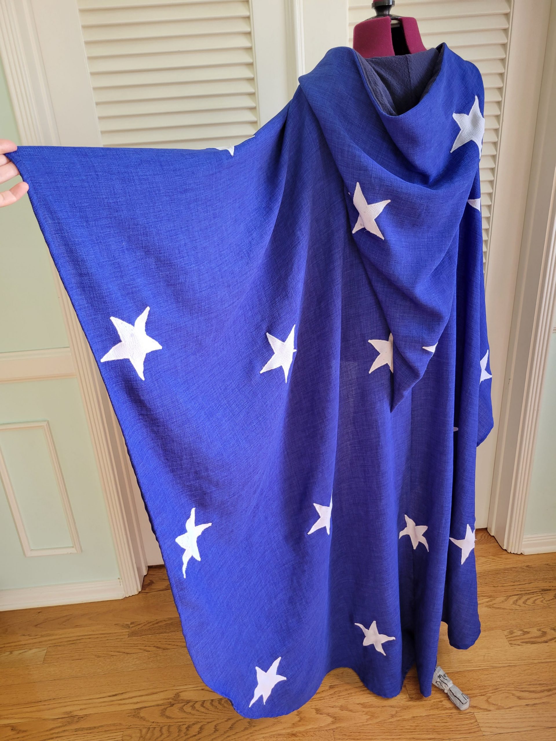 After hemming the cloak, I moved on to attaching the stars. They were cut out of a white version of the faux linen, and spray basted before using a zigzag stitch to applique them on. I think this the cloak, hood and hat had around 40 stars total. 🥲