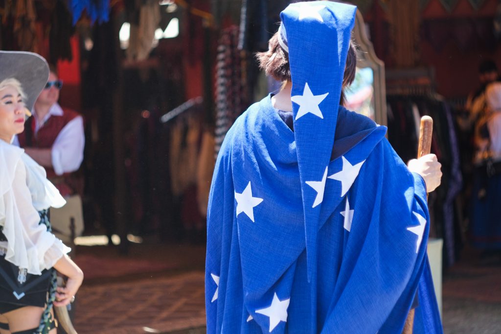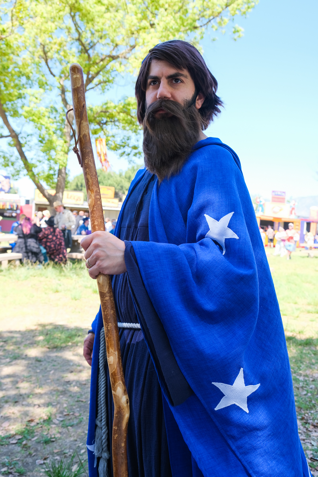It finally happened – Mike dressed up for the ren faire. 🧙 For many years now, we’ve joked with our friends that he would dress up for the faire if I made him a Merlin costume. It had to be classic Merlin, but a little gritty, and the biggest sticking point was the hat – many times he described exactly how long, flaccid and sock-like it had to be. A few years ago I even tried to start making the costume, but he was so unsatisfied with the fabric options at jo-anns that we left empty handed.