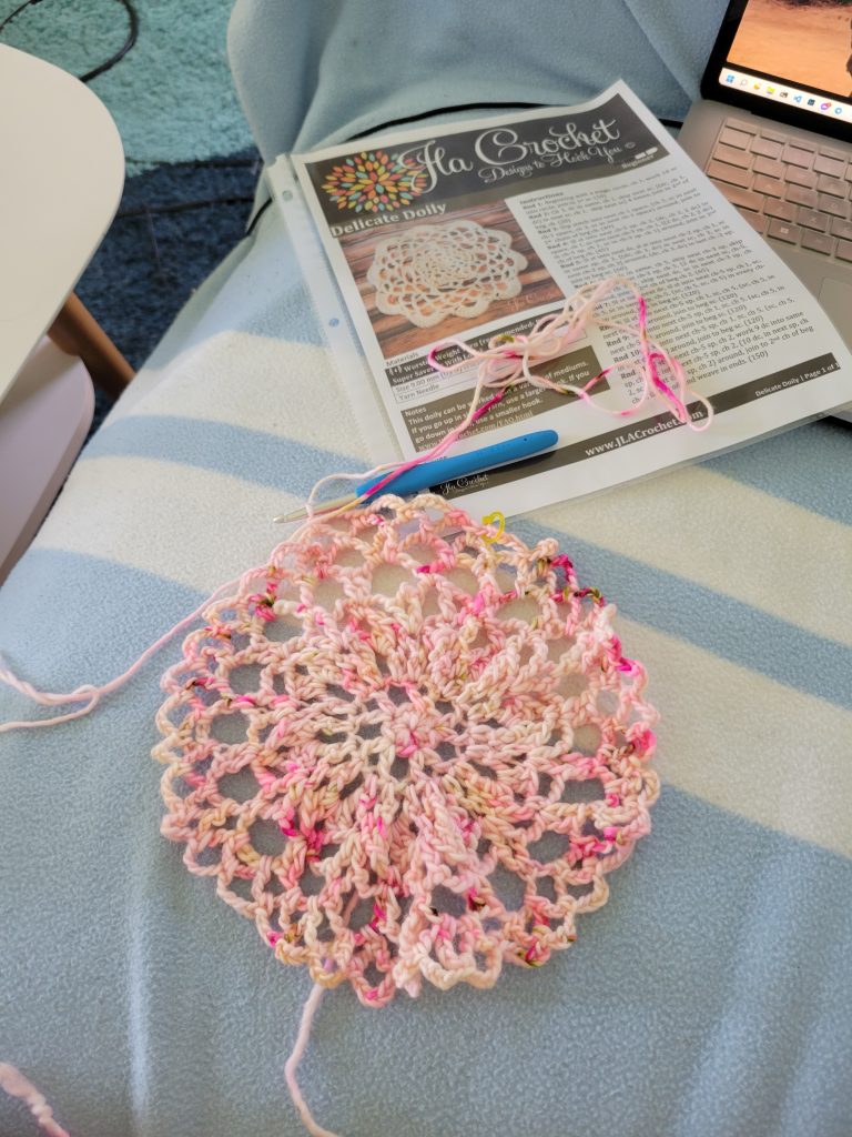 I wanted to make something simple with this yarn that would really showcase the colors, and also something that I could put out on display and enjoy seeing all the time. I settled on a doily, and found this one by Leigh Ann Atwell on Ravelry.