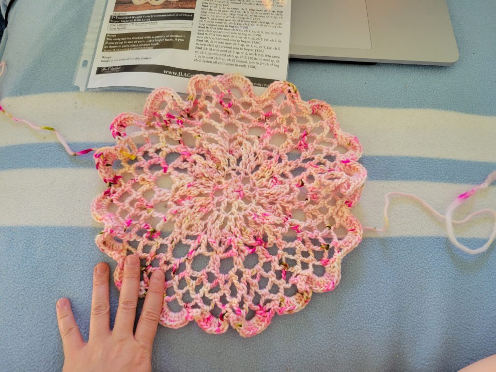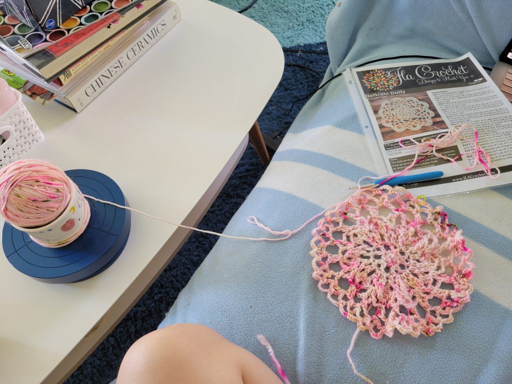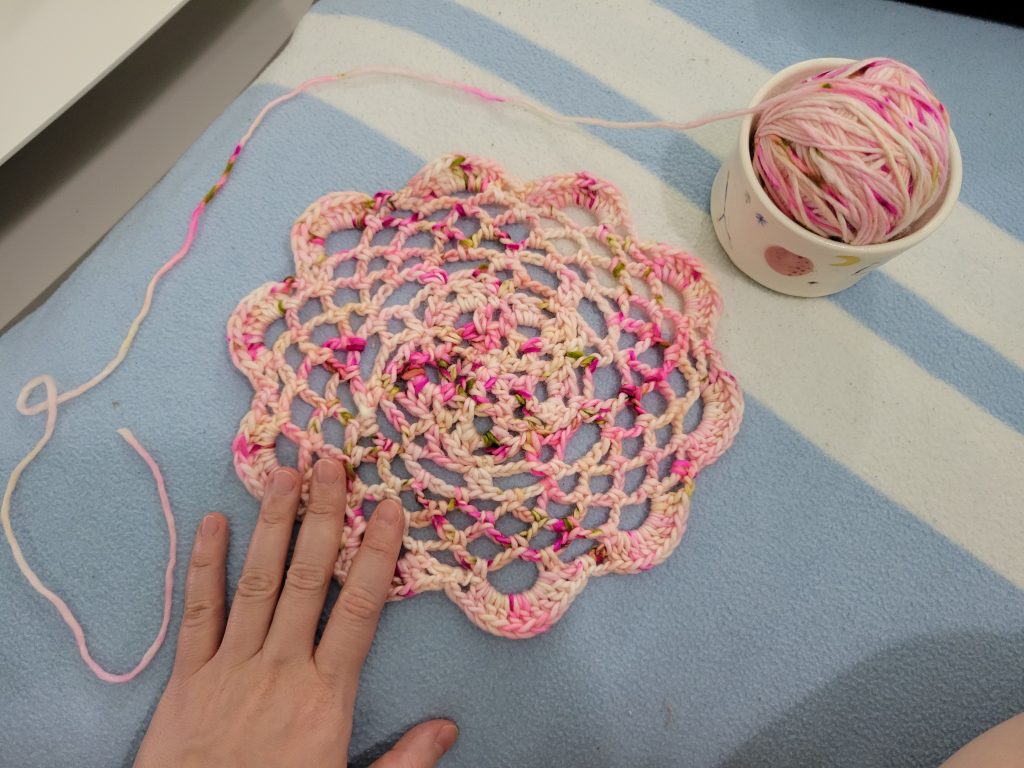 Since I had so much yarn left over, I decided to make another doily to possibly gift someone in the future. And after completely this one and wondering why it was much smaller than the first doily, I realized where I’d made the mistake previously haha. This one had a much more defined flower shape before wet-blocking.