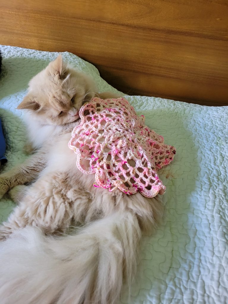 Below is the first doily right after I finished crocheting it. I was a bit concerned that it had so much extra volume that looked like it might prevent it from laying flat (a result of my following the directions incorrectly), but after I wet-blocked it it looked fine. 🙂