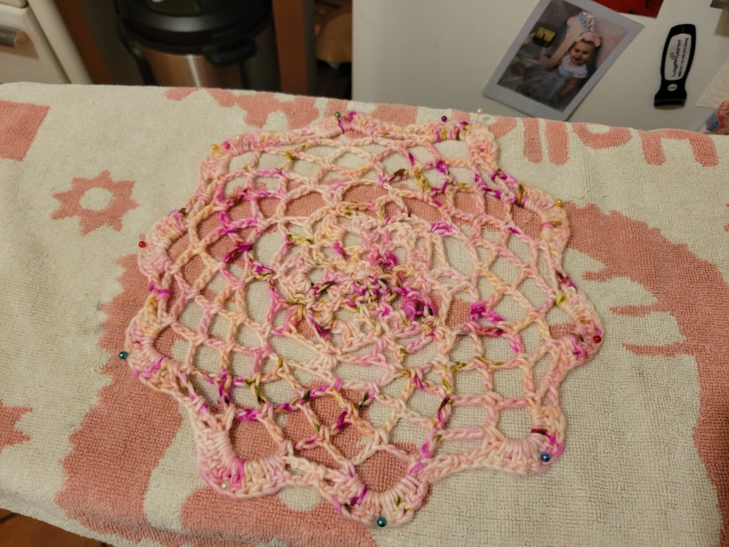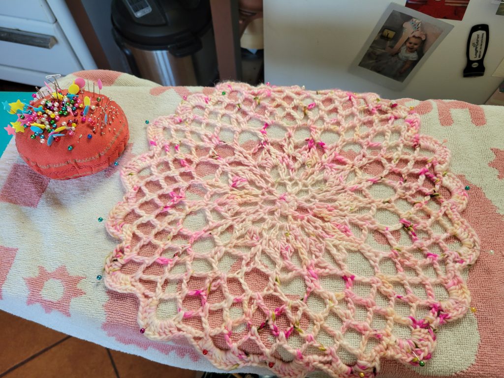 I looked up how to wet-block superwash merino and mostly followed these instructions by Very Pink (although I just used warm water without any wool wash or soap). The doily ended up laying nice and flat! ♡