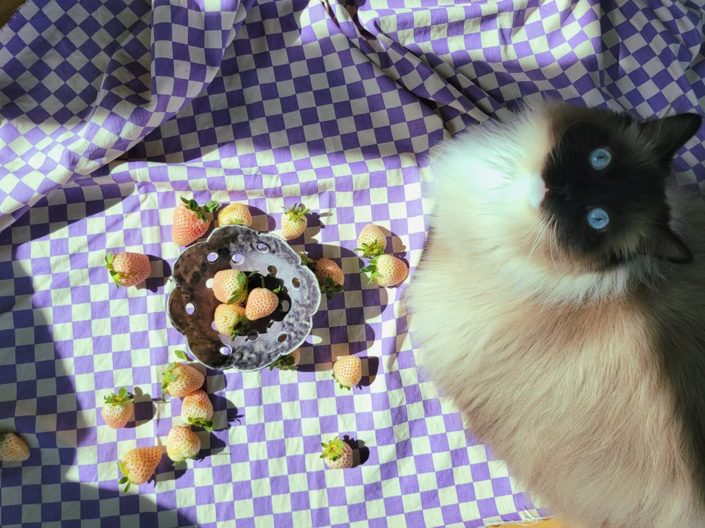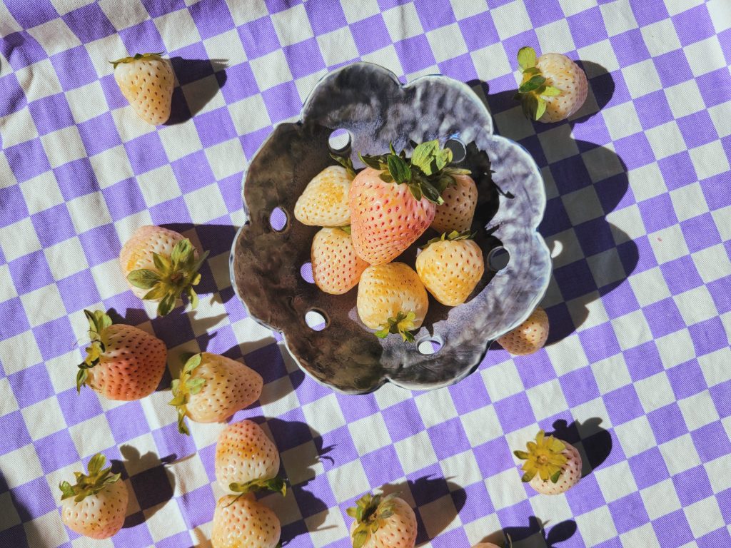 My mom washed some pink strawberries in the berry bowl I made her for xmas so I took advantage of the sun and did a mini photoshoot~