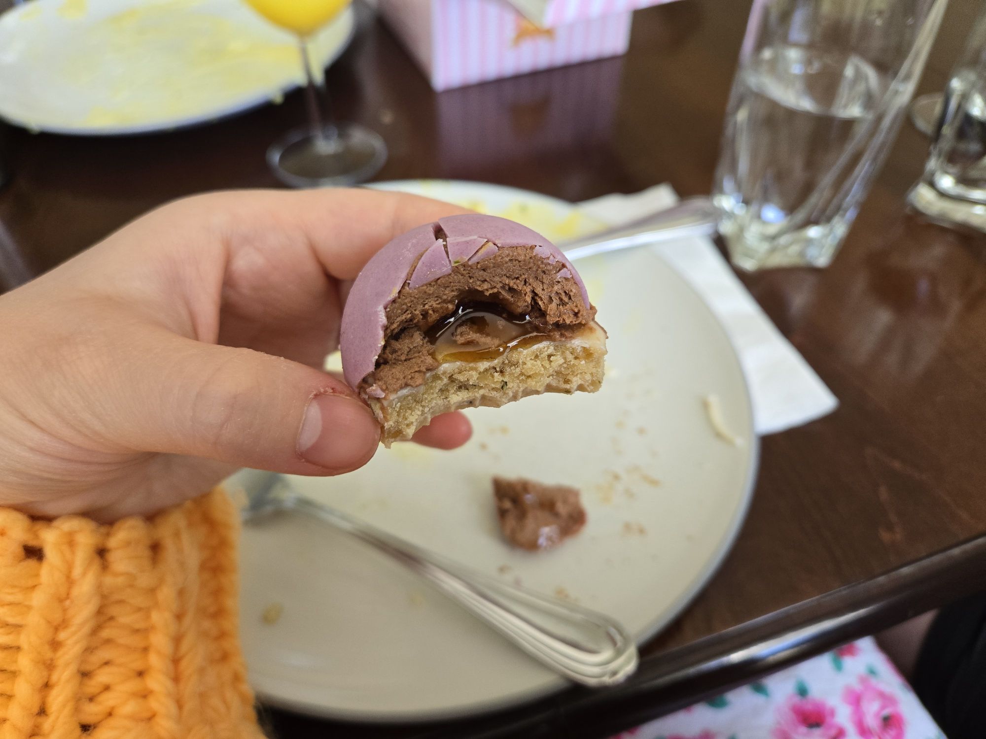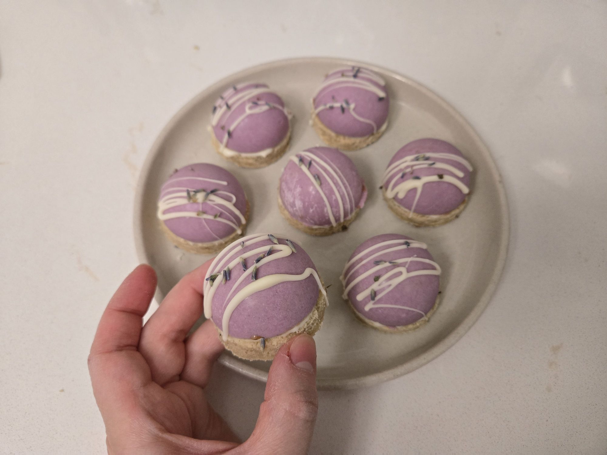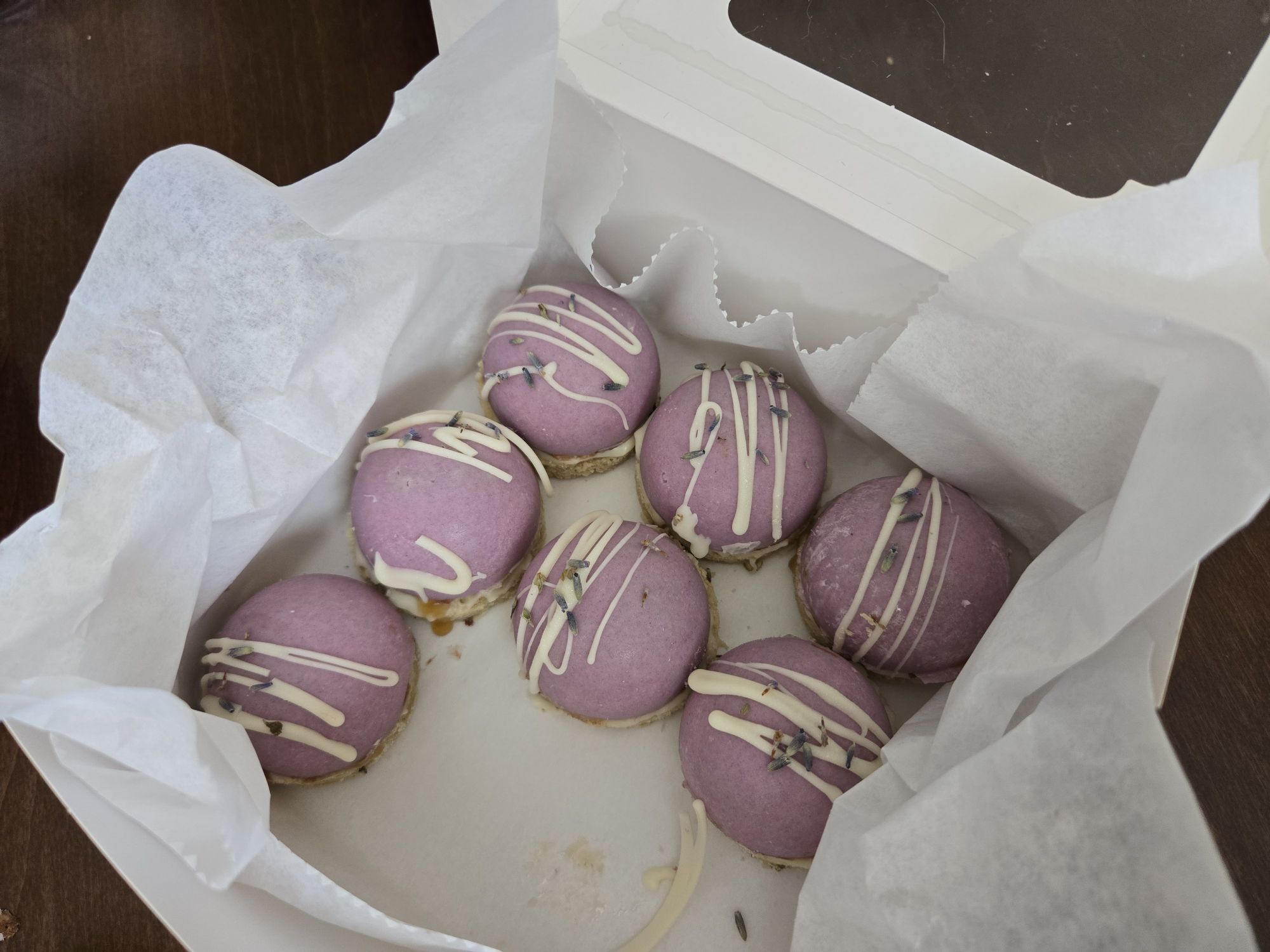 These have a white chocolate shell colored with purple potato powder, a chocolate mousse, white peach lavender jam (from the farmers market) and a lavender honey shortbread base. I brought these to Mike’s parents house for mothers day. ♡
