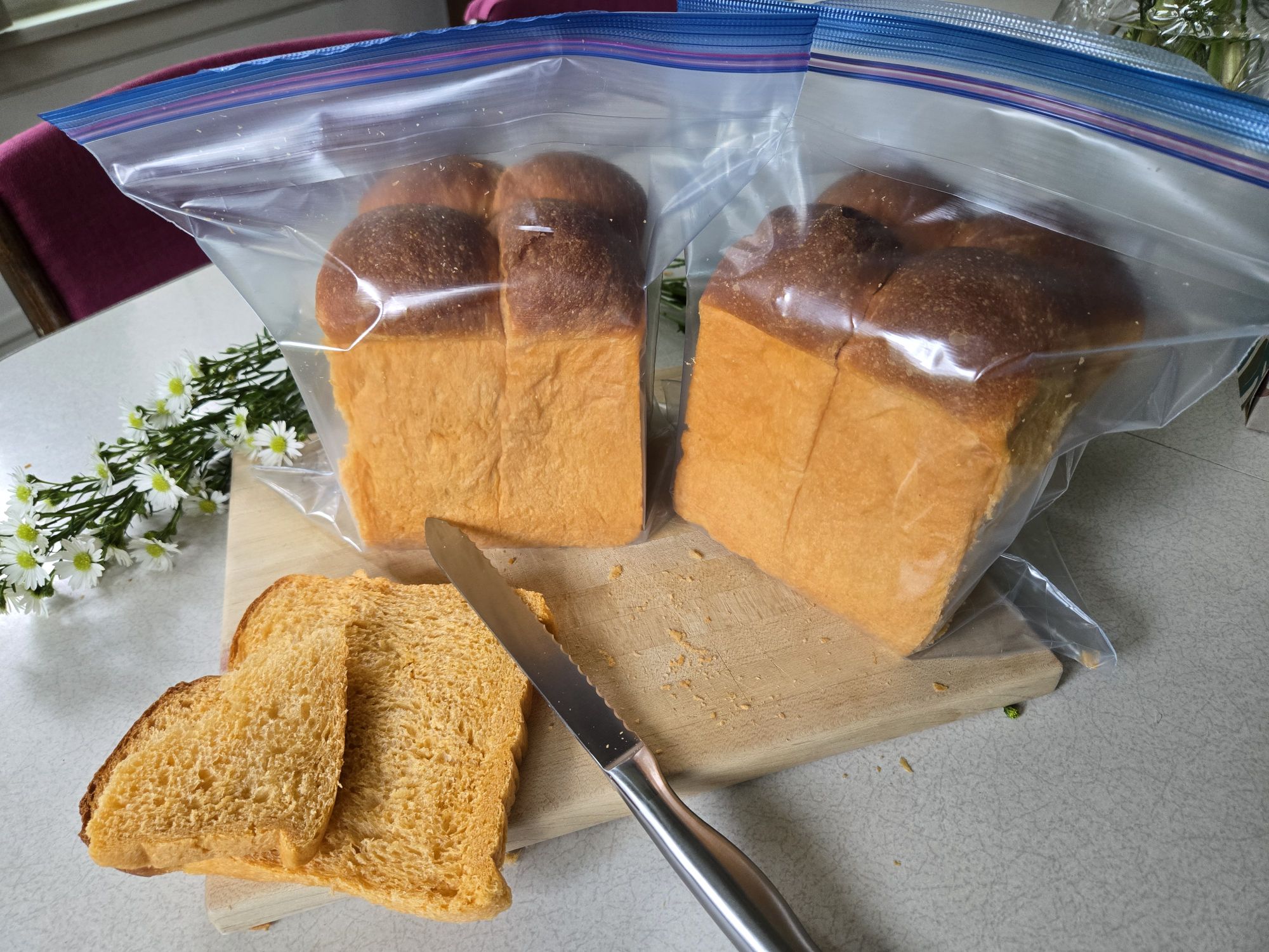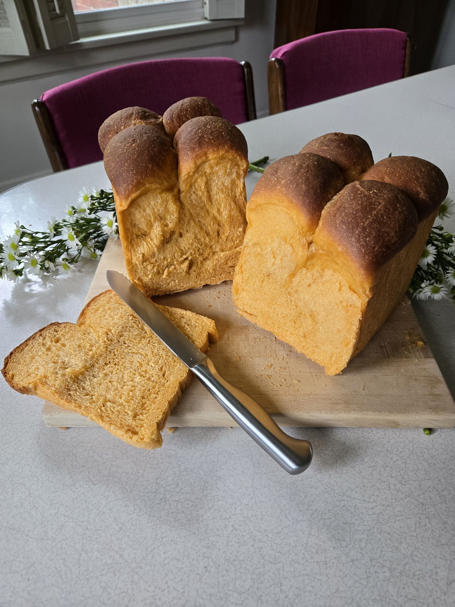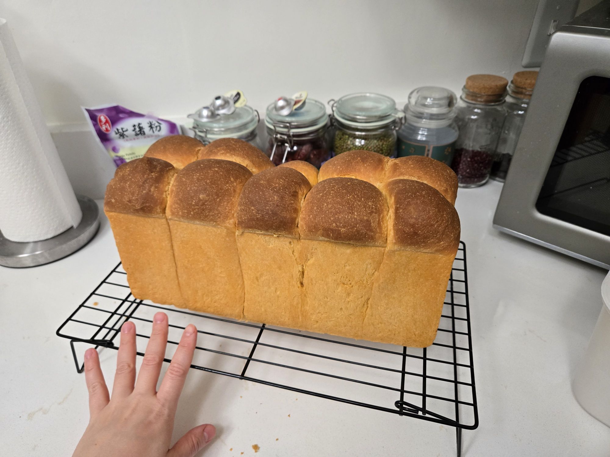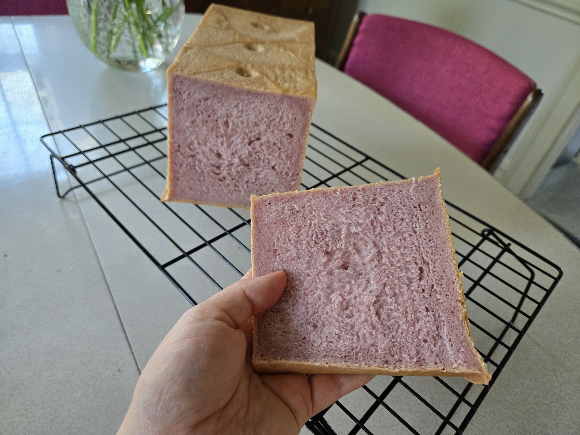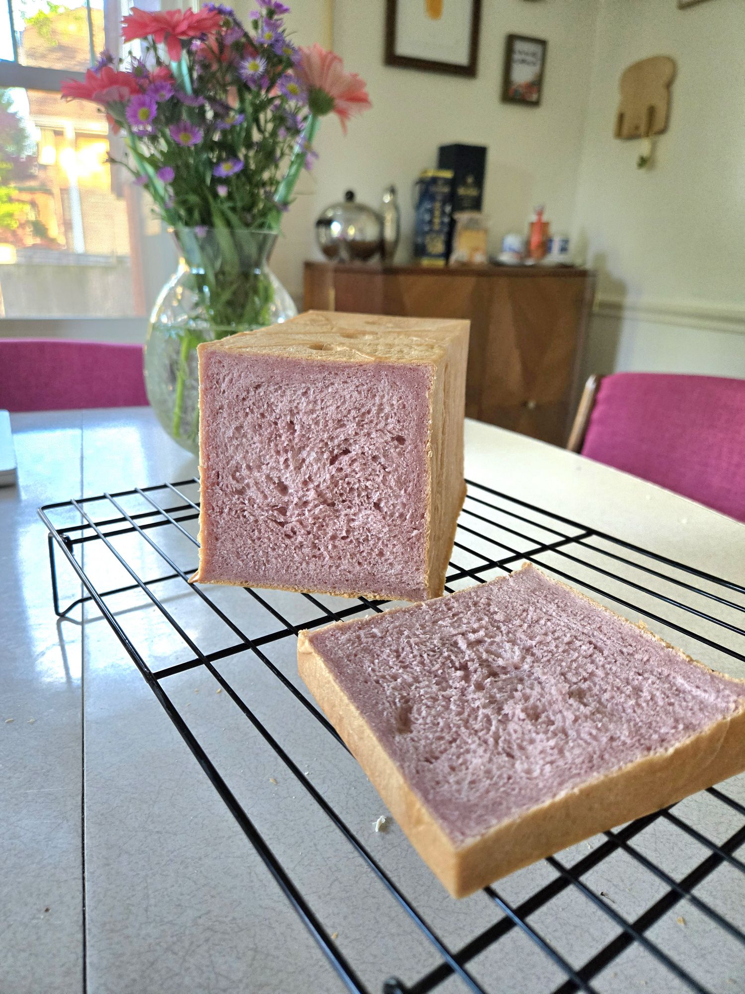 Next, I baked a taro milk bread loaf, and used the tin I got from my mom for the first time (on my own – i made them growing up with my mom!). I used the recipe from Kristina Cho’s ‘Mooncakes and Milkbread’ book, and added purple potato powder and taro extract.