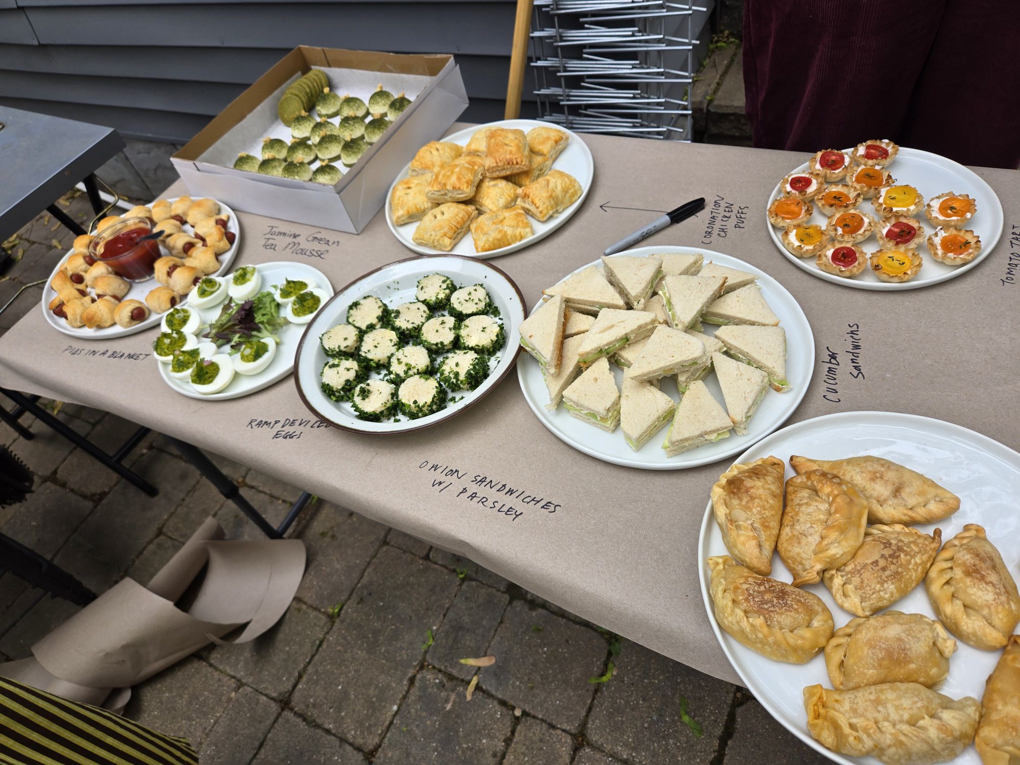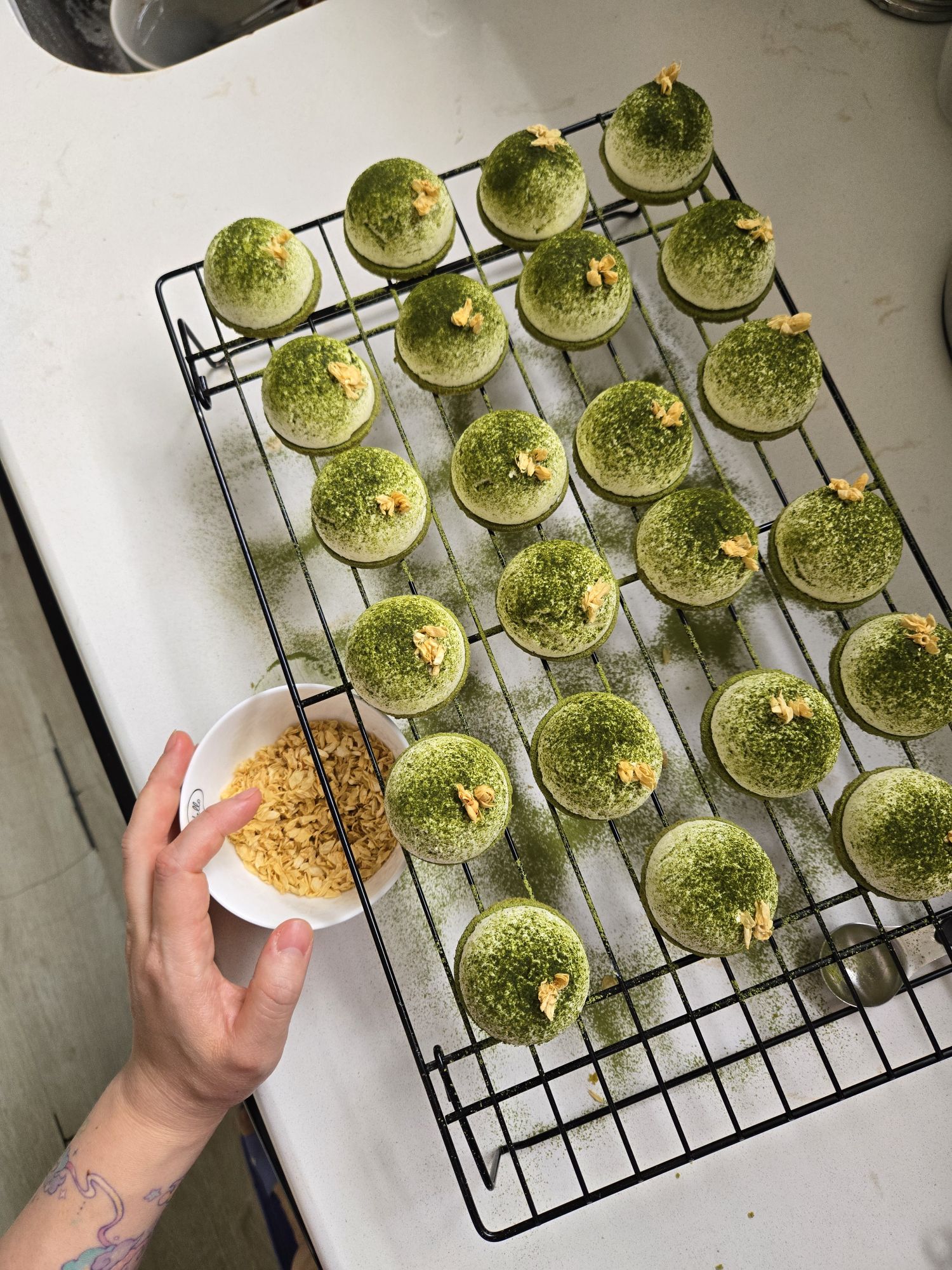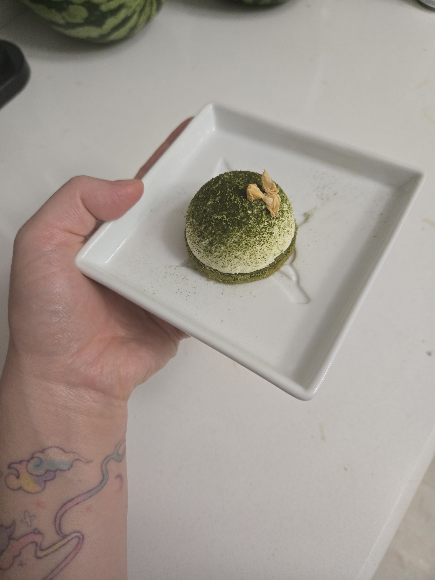 I used the dome molds again for our friend Diego’s birthday party, which was hors d’oeuvres themed. These had a matcha shortbread base, a jasmine white chocolate mousse, and a jasmine green tea jelly center. 🌿