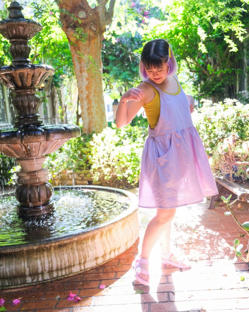 I wore my newest sewing project to hang out with friends in a non-zoom setting today~ β‘ This was made using the Steele Pinafore pattern byΒ Elbe Textiles, which is available in up to a 58.5″ bust. I call it a “cheater” Steele Pinafore because I was feeling lazy and nixed the open sides and buttons…